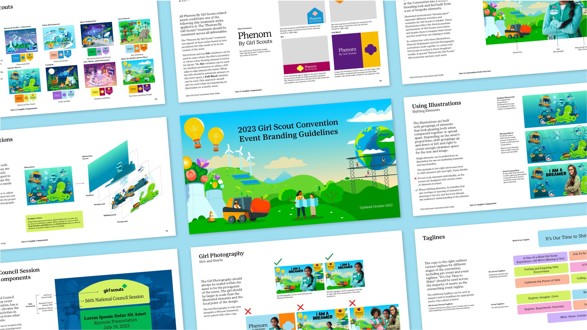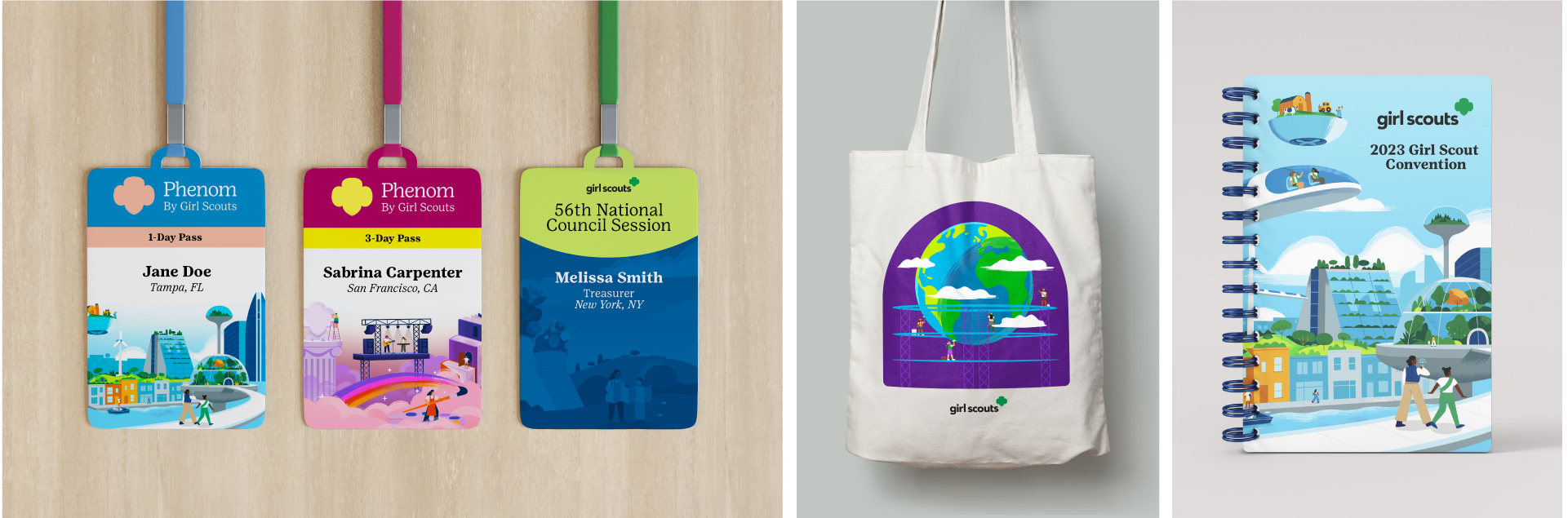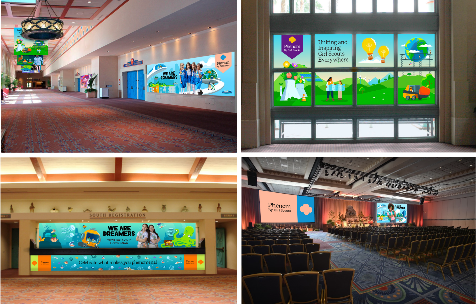 While working with Town Hall, I developed the brand look and feel for the 2023 Girl Scouts of the USA convention. The theme of the year was “Phenom” and our goal was to celebrate what made girls phenomenal. The concept centered around “dreamscapes”, colorful imaginary places that reflect the diverse passions and interests of Girl Scouts everywhere and inspire them to imagine their future and the world they are helping to build.