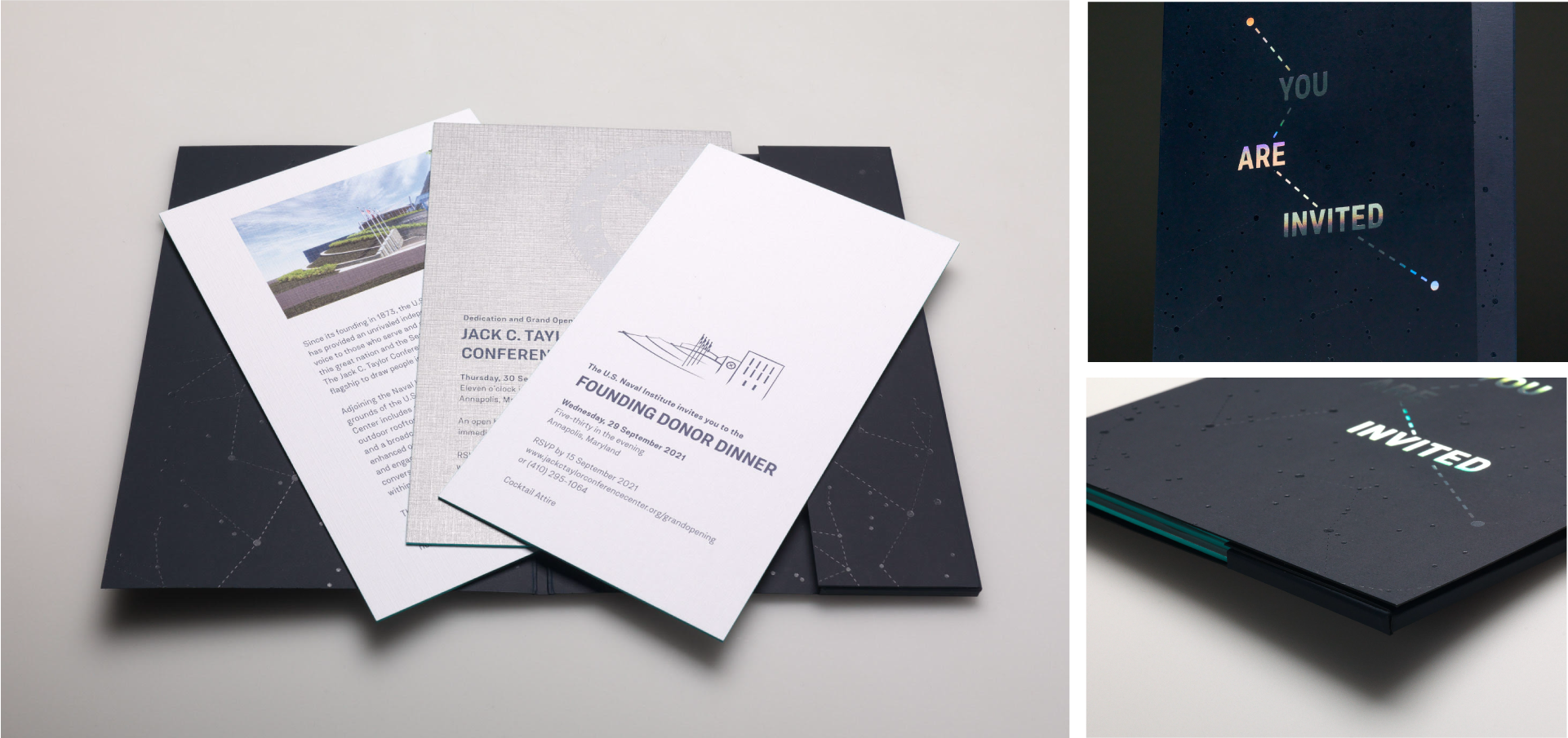 Finally, we designed a luxurious printed invitation for the opening ceremony of the conference center, with textures, colors and foil details mimicking that of the physical space.