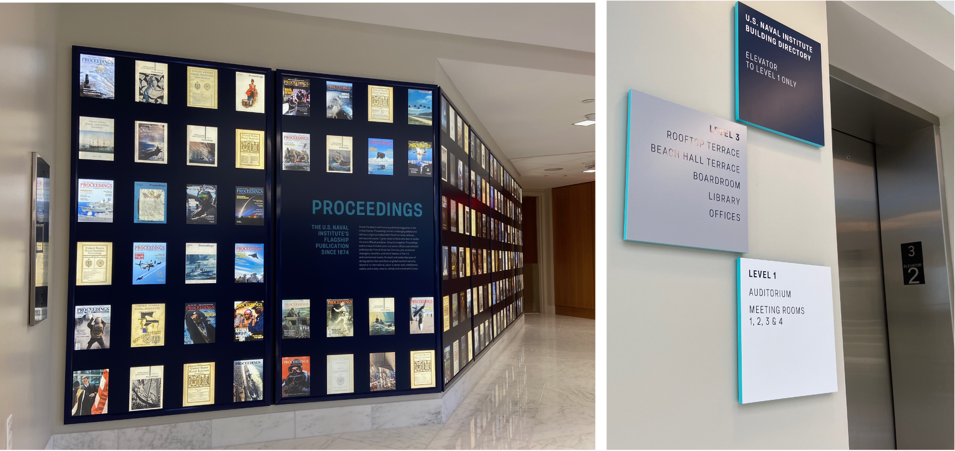 We also developed an accompanying wayfinding system for the new conference center, and a display for their Proceedings magazine, one of the oldest continuously published magazines in the United States.