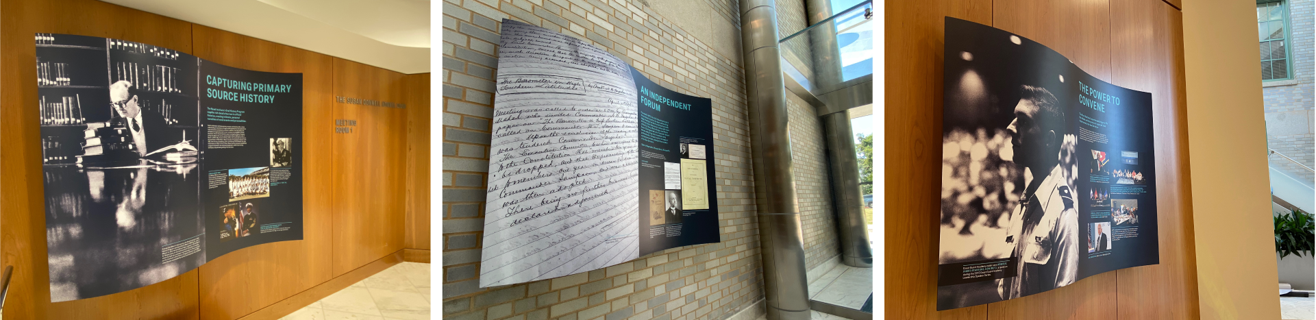 Throughout the space are a series of graphic displays that tell the history of the institute. The form of these displays mimics both a page from a book and an undulating wave, inspired by their mission to be the leading organization for literary and scientific thought leadership within the naval profession.