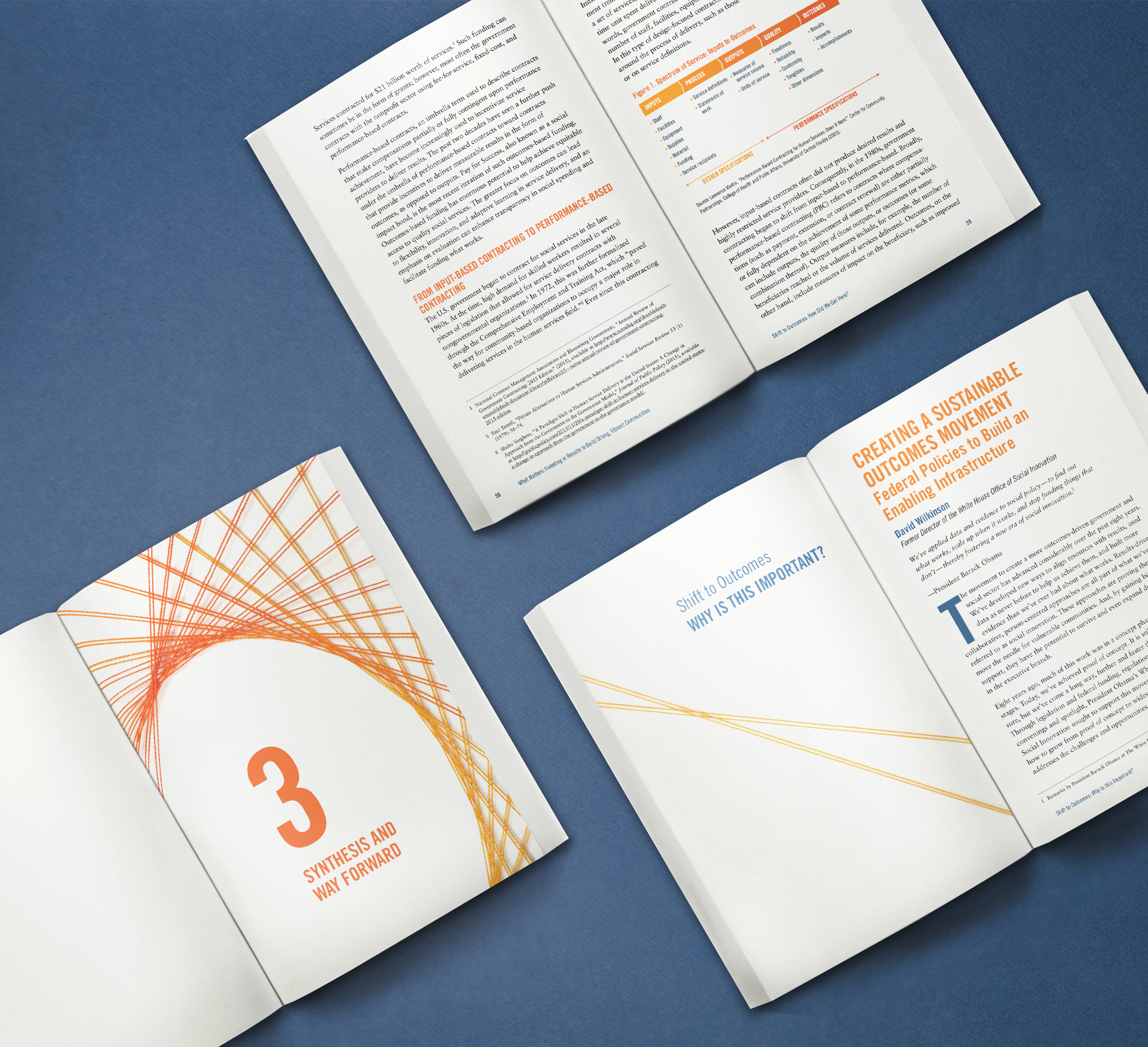 Using a branded color palette of blues and oranges, the cover illustrates how straight lines can be woven into a curve. The design process echoes the book's focus on how outcome-based collaboration—instead of an output-based approach—results in positive, long-term impact. The string metaphor reinforces the motif of collaboration— that working toward a common goal produces something greater than the sum of its parts. At the heart of this book design is the idea that the ‘insignificant’ straight lines when focused on a shared outcome can lead to something coordinated and complete.
